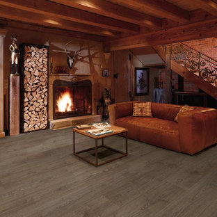 75 Beautiful Laminate Floor Living Room with a Wood Fireplace Surround Pictures & Ideas – August